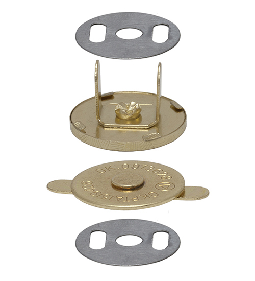 Broche para bolsa o cartera, magnético, fabricado en hierro, con acabado latonado. Tiene un diámetro de 18mm y es ultraplano para no abultar.