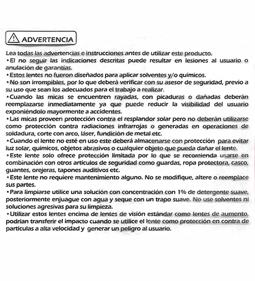 ¡Lee siempre la advertencia! Antes de utilizar los lentes de seguridad, es fundamental leer las advertencias y las instrucciones de uso para garantizar una protección adecuada y un desempeño óptimo.